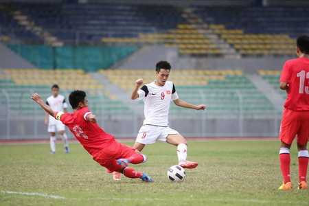 20' NGUY HIỂM... Văn Toàn cầm bóng dốc thẳng vào vòng cấm U19 Hong Kong rồi tung ra cú sút. Bóng đi hơi thiếu lực và không thể đánh bại được thủ thành Ho Chun.