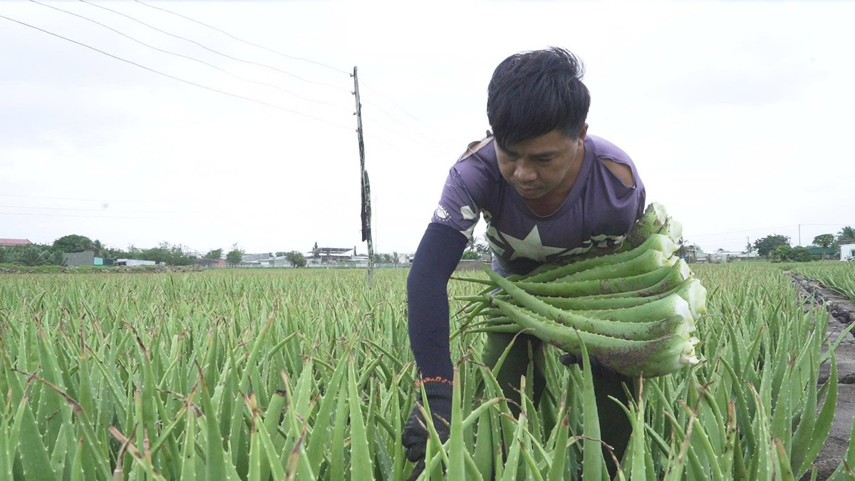 Ngay gần đó, vườn nha đam của gia đình anh Lê Nguyễn Công Tuân cũng đang vào vụ. Anh Tuân cho biết, cây nha đam dễ trồng, ít sâu bệnh nên hầu như không phải dùng thuốc trừ sâu, vừa tiết kiệm chi phí, vừa an toàn cho người làm nông mà còn dễ tiêu thụ, thu hoạch nhanh, giúp quay vòng vốn hiệu quả. “So với trồng hành tỏi trước đây, giờ mỗi sào nha đam có thể mang về thu nhập khoảng 10 triệu đồng mỗi tháng. Gia đình tôi và nhiều người ở đây không còn phải đi làm thuê xa nữa”, anh Tuân phấn khởi.