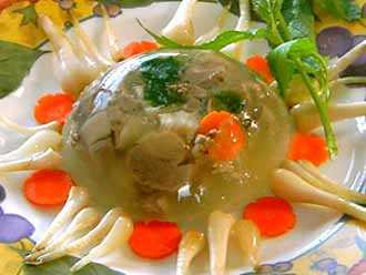 Cho phần thịt đã ướp vào nồi rồi châm nước sôi ngập thịt khoảng ¼ đốt lóng tay. Sau khi nấu sôi hạ bớt lửa để nồi thịt chỉ sôi nhẹ và vớt liên tục cho hết bọt. Nếu nước cạn, châm thêm nước để giữ mức xâm xâm mặt thịt và nấu cho đến khi thật rục. Rắc vào bát đựng một ít tiêu rồi múc thịt đổ vào. Thịt sẽ đông khi nguội.