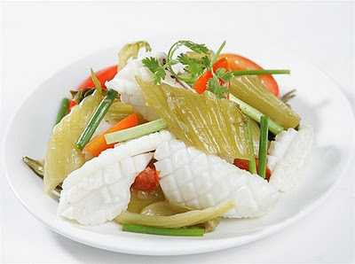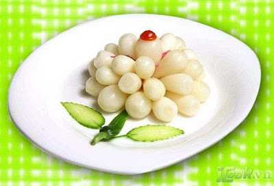 Cách làm: Su hào, đu đủ, gọt vỏ cắt miếng dày 2 mm dài 5 cm. Cà rốt tỉa hoa cắt dày 2 mm. Củ cải trắng cắt cọng dày 1 cm, dài 4 cm.