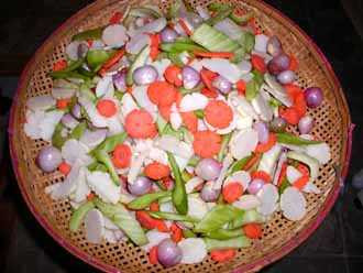 Tất cả cho vào ngâm với nước muối 1 ngày. Vớt ra, ngâm với phèn chua khoảng 20 phút, xả sạch, vắt thật ráo. Phơi rau củ một nắng, khi phơi nhớ trở đều. Tỏi, ớt, phơi cho héo.