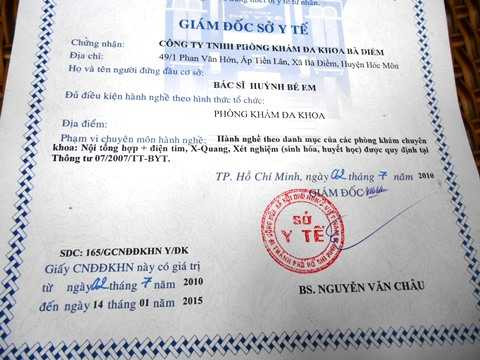 Giấy phép hành nghề của phòng khám đa khoa Bà Điểm (Hóc Môn) có giá trị từ ngày 2/7/2010 đến 14/1/2015. Ảnh: Huy Phan
