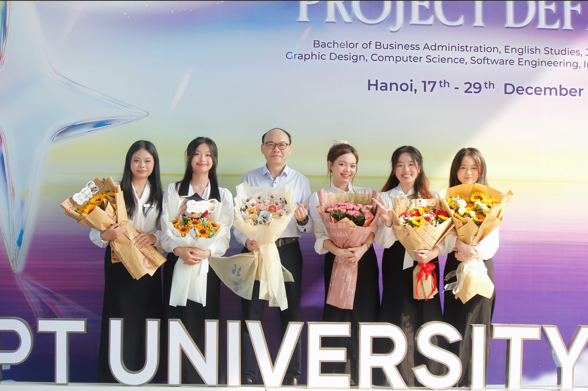 Nhóm dự án Oh!Bầu chụp cùng giảng viên hướng dẫn Lê Hoàng Anh (giữa) tại buổi bảo vệ đồ án tốt nghiệp.