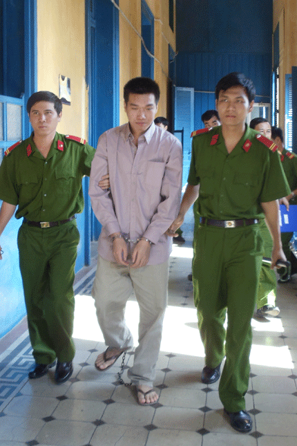 | Chí đang được dẫn giải ra xe chở phạm |