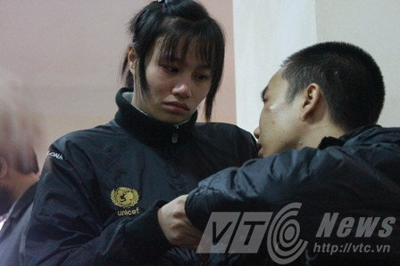 Tại phiên tòa sáng nay, khi HĐXX đang nghị án, vợ bị cáo Hoài khóc cạn nước mắt khi gặp lại chồng. Giây phút giáp mặt hiếm hoi từ khi Hoài gây ra vụ án nghiêm trọng trên. Nắm tay Hoài, người vợ trẻ nói không thành tiếng.