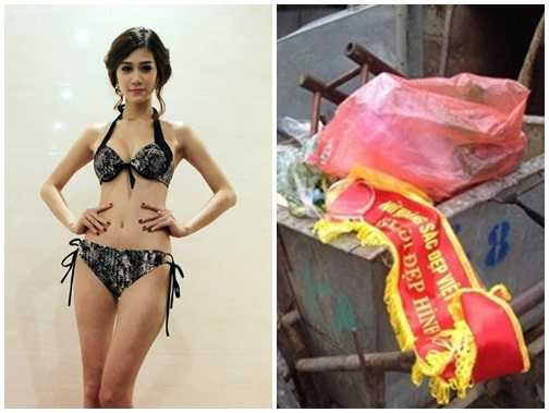 | Thí sinh tham dự cuộc thi Nữ hoàng sắc đẹp Việt Nam vứt dải băng danh hiệu ‘Người đẹp hình thể’ vào xe rác. |