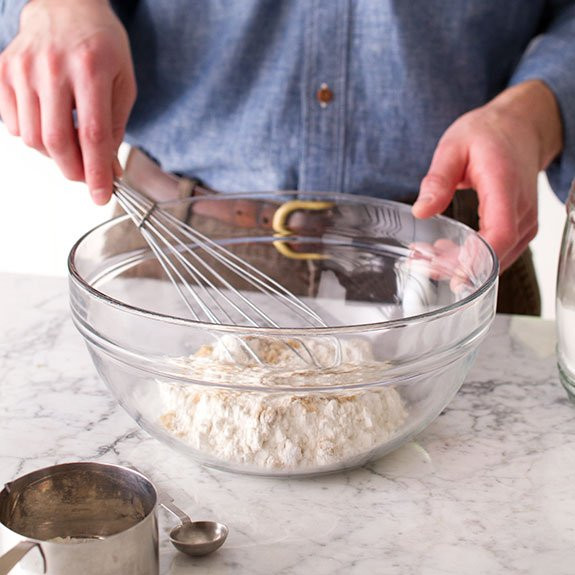- Trong một bát khác, đánh trứng và sữa bơ, sau đó đổ vào hỗn hợp bột và khuấy cho đến khi các thành phần kết dính lại với nhau.