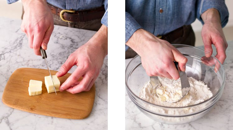 Chia bơ thành các khối nhỏ và cho vào hỗn hợp vừa trộn. Sử dụng một chiếc thìa hoặc muỗng lớn để dằm cho miếng bơ tan nhỏ ra.