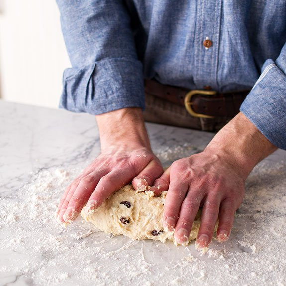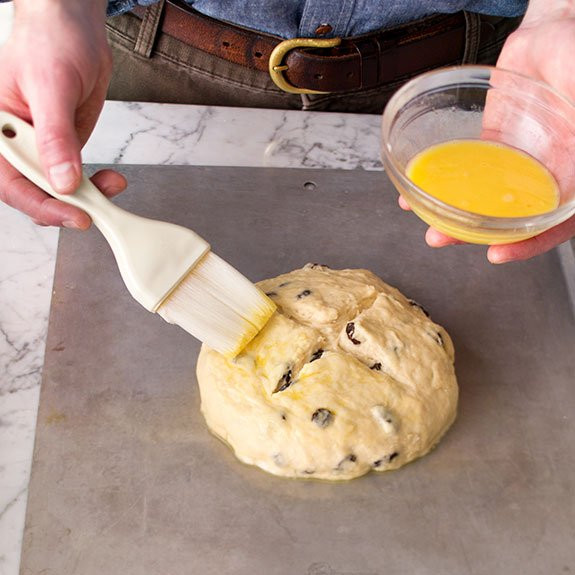 - Đặt bánh vào khay nướng đã quết mỡ. Sử dụng một con dao để cắt chữ "X" nông lên mặt trên của chiếc bánh.