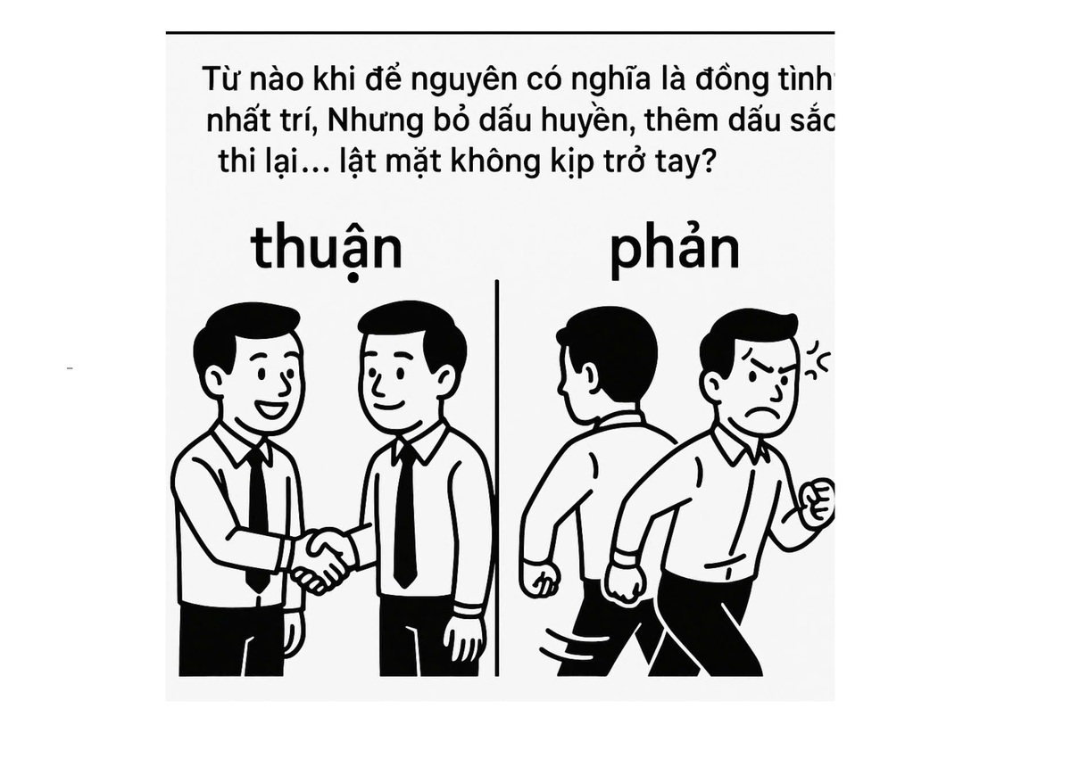 Không chỉ cho ra các từ có nghĩa khác hoàn toàn mà nhiều khi, việc đổi thanh dấu còn khiến chúng ta có những từ trái nghĩa đầy thú vị. Chẳng hạn như 2 từ được nhắc đến trong câu đố sau đây. Hãy thử xem, bạn có tìm được ra đáp án cho câu đố này: "Từ nào để nguyên nhất trí đồng tình, bỏ huyền thêm sắc lật mặt quá nhanh?".