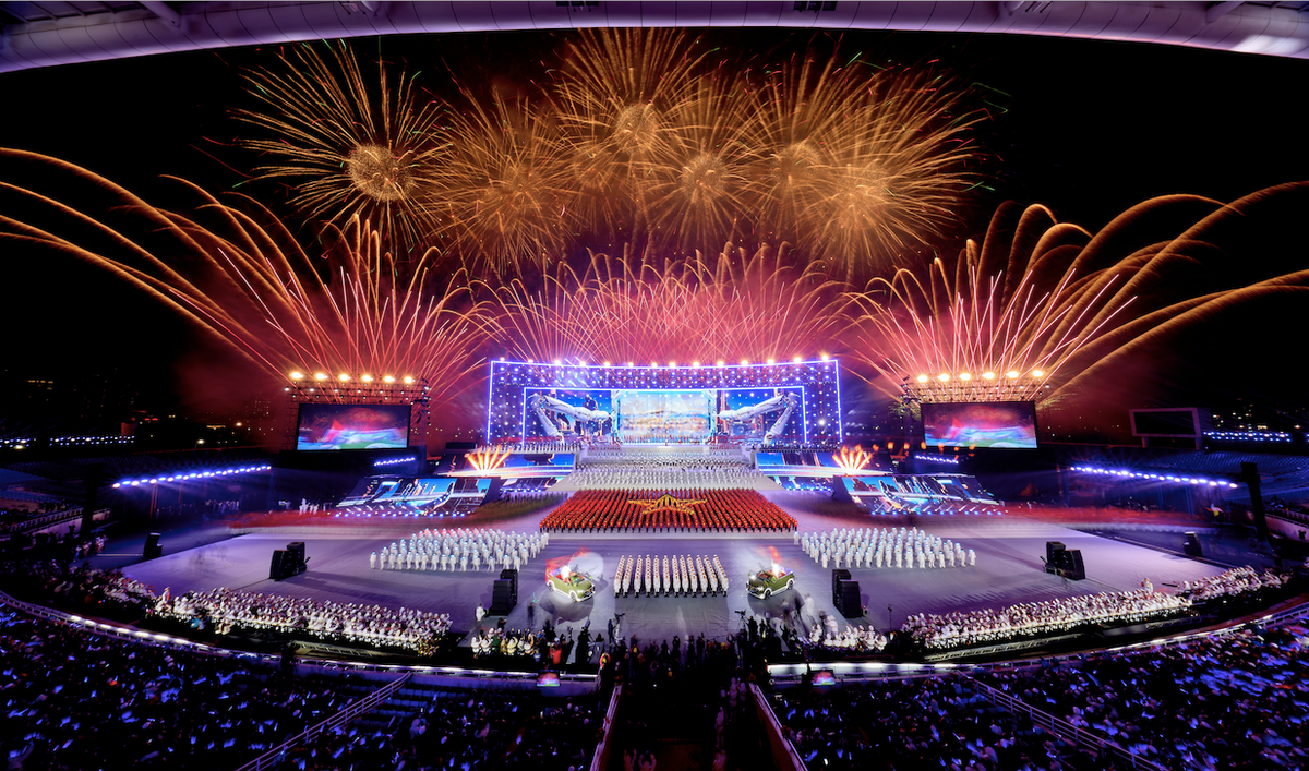 Ở những cao trào của chương trình, hàng nghìn quả pháo hoa tầm cao đồng loạt khai hỏa, kết hợp hệ thống giàn phun hỏa thuật trên mái và hai cánh khán đài, đẩy cảm xúc khán giả lên đỉnh điểm.