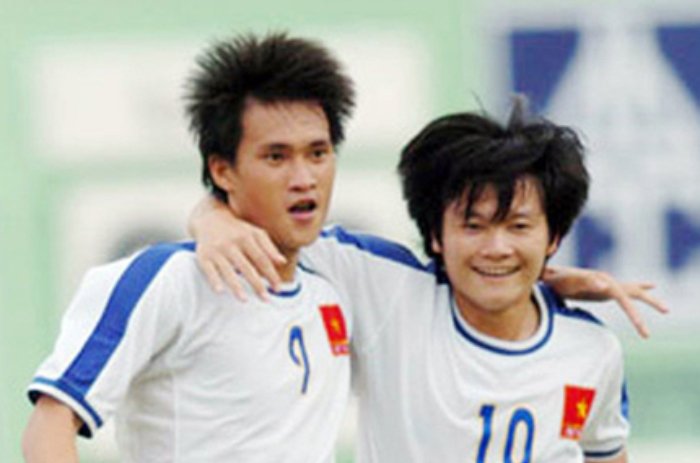 Năm 2003, Công Vinh (trái) được thi đấu ở đội hình chính thức của tuyển Sông Lam Nghệ An. Sau đó, anh được huấn luyện viên Alfred Riedl triệu tập bổ sung anh vào đội U23 Việt Nam tham dự SEA Games 22. Ở thời điểm ấy, anh vẫn bị đánh giá thấp hơn đồng hương Văn Quyến (phải).
