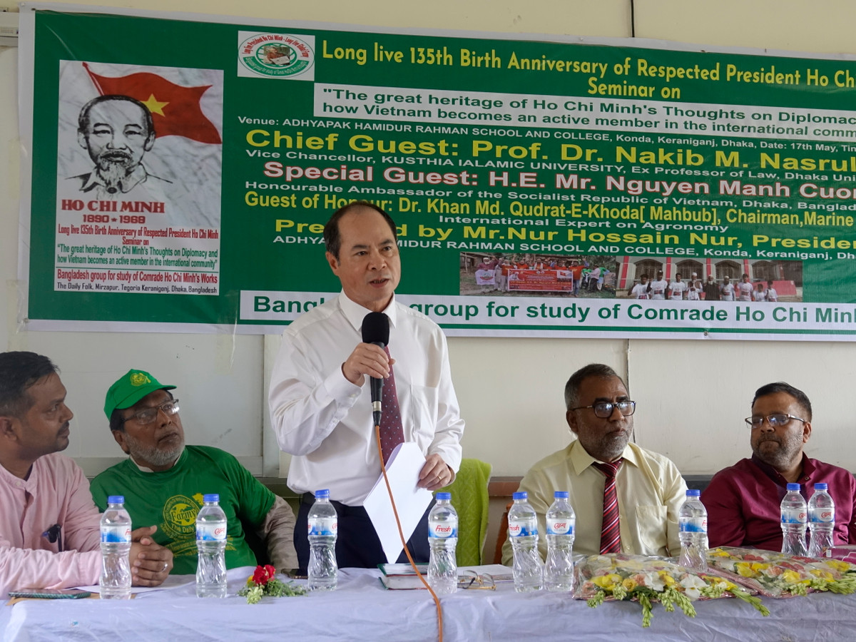Nhân dịp kỷ niệm 135 năm Ngày sinh Chủ tịch Hồ Chí Minh và 50 năm Ngày giải phóng miền Nam, thống nhất đất nước, ngày 17/5, Đại sứ quán Việt Nam tại Bangladesh phối hợp với Nhóm học giả Bangladesh nghiên cứu về Chủ tịch Hồ Chí Minh tổ chức Tọa đàm “Di sản tư tưởng ngoại giao Hồ Chí Minh và thành tựu của Việt Nam khi trở thành thành viên tích cực trong cộng đồng quốc tế” tại thủ đô Dhaka.