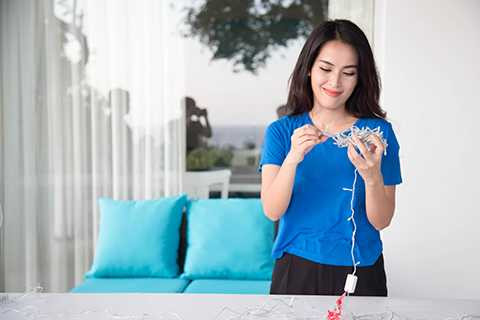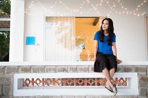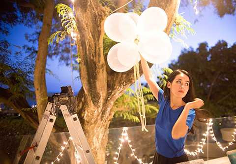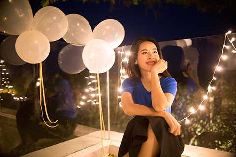 | Chuẩn bị cho phần tiệc tối, Tú Vi còn tự tay cắm hoa, giăng đèn dây trang trí, thổi bóng bay… trang hoàng không gian nơi diễn ra cuộc vui. |