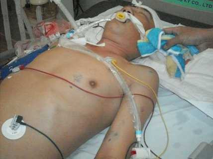 | Anh Hiền đang điều trị tại BV Vĩnh Phúc trong tình trạng hôn mê sâu, chấn thương sọ não và nhiều vết thâm trên cơ thể. Ảnh do gia đình cung cấp. |