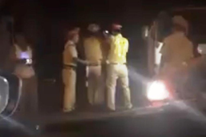 Hiện trường tổ công tác CSGT Công an thị xã Hồng Lĩnh xử lý vụ việc liên quan đến ông Đinh Quốc Kỳ và Đinh Quốc Thông. (Ảnh cắt từ clip)