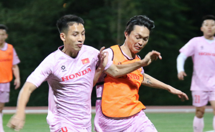 Tuấn Anh (phải) tập bình thường cùng đồng đội. (Ảnh: VFF)
