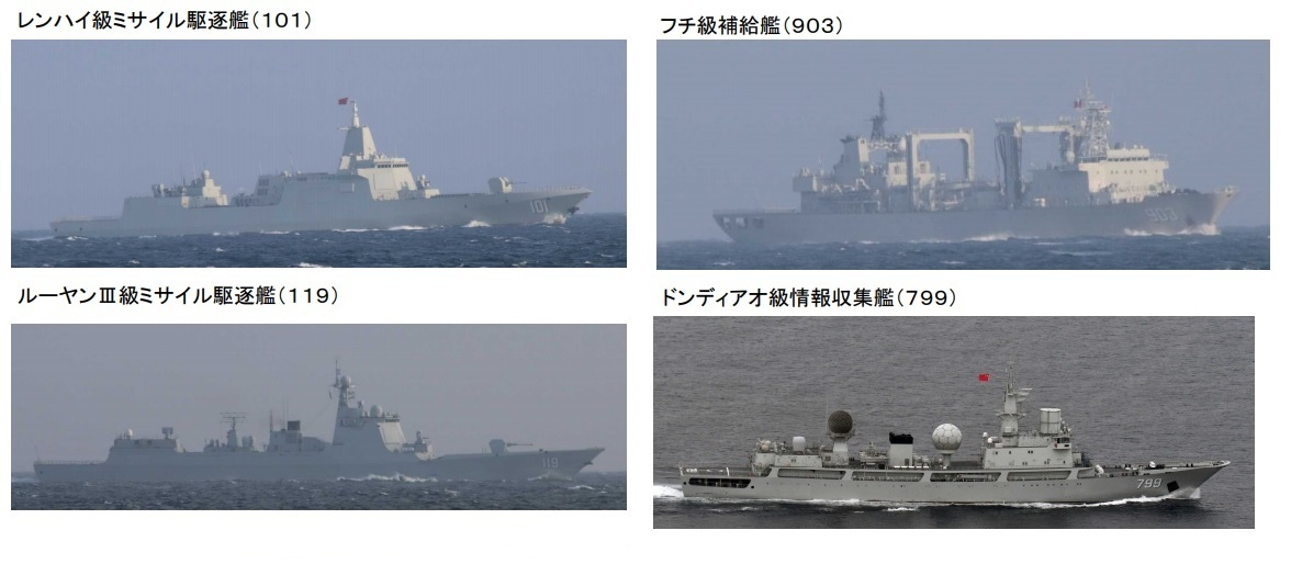 Danh tính các tàu Trung Quốc này chưa được tiết lộ. Song theo chú thích của một bức ảnh, các tàu "bao gồm một tàu tuần dương tên lửa dẫn đường, một tàu khu trục tên lửa dẫn đường, một tàu do thám và một tàu hậu cần".