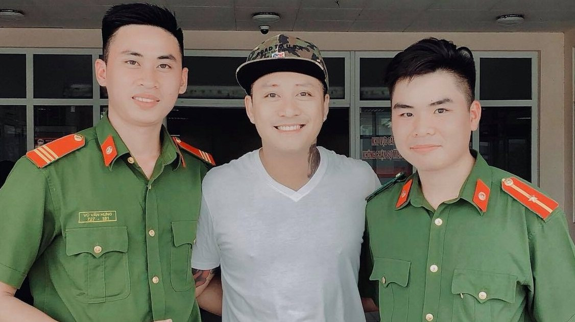 Tuấn Hưng chụp ảnh cùng các chiến sĩ công an địa phương sau khi làm xong thủ tục cần thiết để tìm người nhà cho nạn nhân.