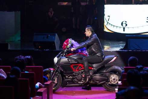 | Trong liveshow của Lệ Quyên diễn ra tối 8/3, Tuấn Hưng phi xe phân khối lớn lên tận sân khấu tặng hoa cho Lệ Quyên. |