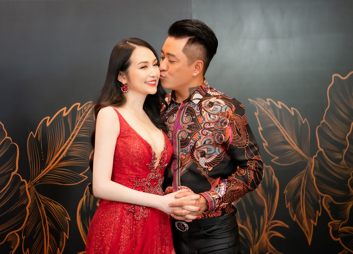 Vợ Tuấn Hưng trang điểm nhẹ, để tóc xoăn dài. Sinh mổ con trai thứ ba - bé Sâm - mới hơn một năm nhưng Hương Baby nhanh chóng lấy lại dáng chuẩn. Cô phô diễn nét đẹp hình thể qua thiết kế tôn đường cong. Nhan sắc của gái ba con được nhiều người khen ngợi là ngày càng mặn mà, trưởng thành.