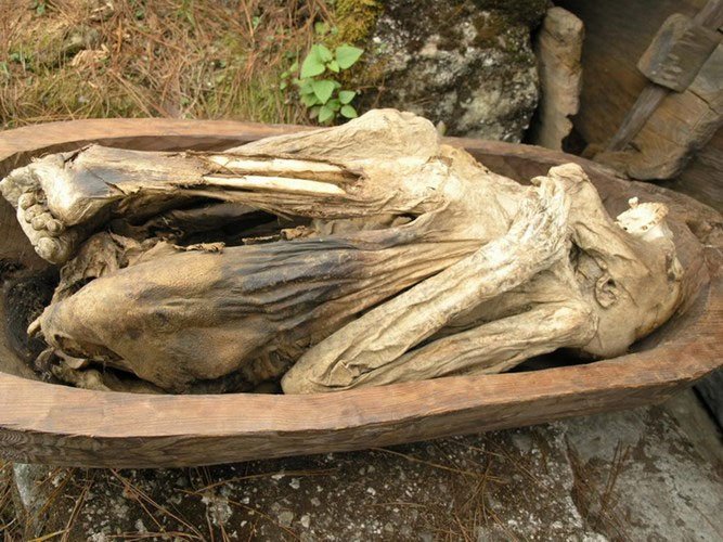 Khi đã trở nên khô hoàn toàn, xác ướp được đặt bên trong một chiếc quan tài làm bằng gỗ thông và chôn cất trong một hang động tự nhiên hoặc hang nhân tạo được đào sâu vào lòng núi đá.