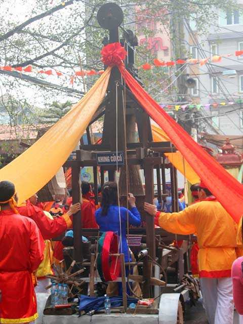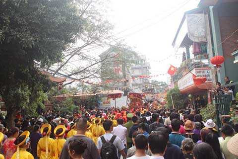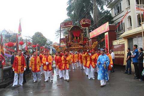 | Đoàn rước đưa kiệu đi một vòng quanh làng với ý nghĩa tâm linh là đưa Đức Thành Hoàng đi du xuân đầu năm mới. |