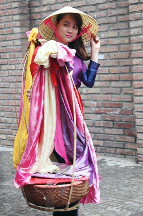 | Những cô gái trẻ quẩy quang gánh chở lụa trên vai. |