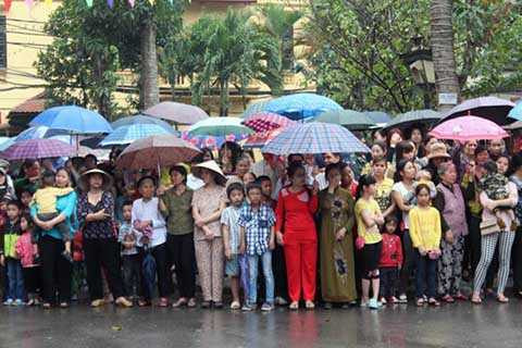 | Rất đông người dân đã đội mưa đứng xem lễ rước trong trật tự. |