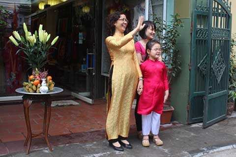 | Những người phụ nữ trong làng diện áo dài, đội nón đi theo xe rước lụa. |