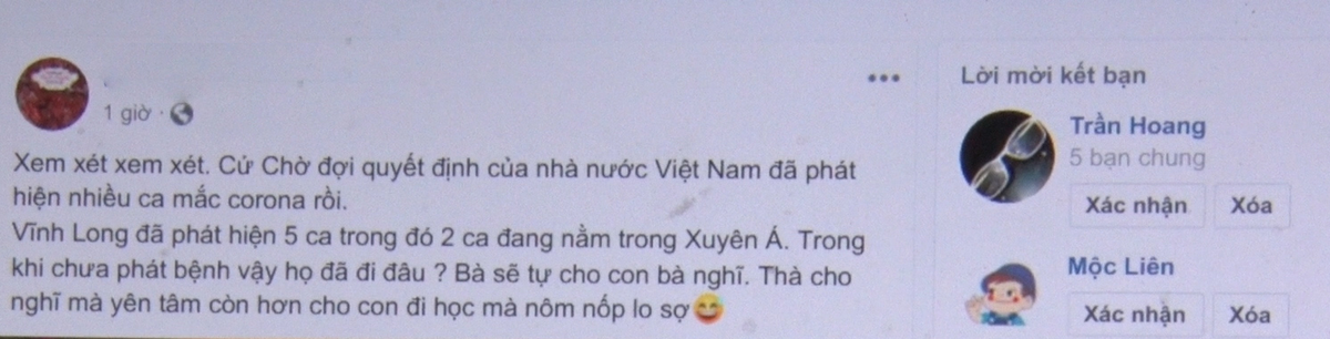 Trước đó, X. sử dụng mạng xã hội facebook với tài khoản là L.X.B.X đăng tải nội dung “trên địa bàn tỉnh Vĩnh Long đã phát hiện 5 ca nhiễm virut corona, trong đó có 2 ca nằm trong Bệnh viện Xuyên Á”.