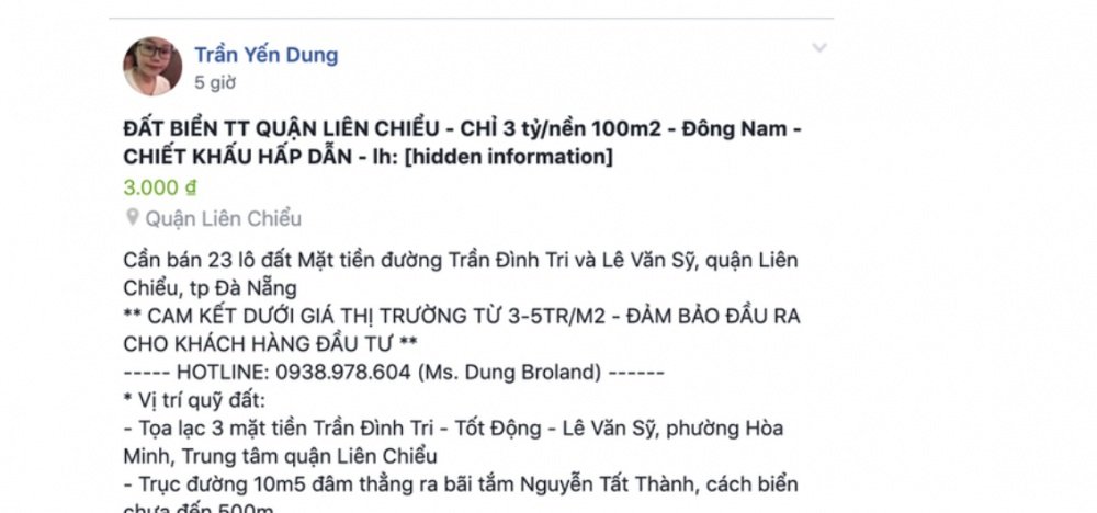 Bà Dung thừa nhận là chủ tài khoản facebook “Trần Yến Dung” và chính bà đăng bài viết có nội dung bán 23 lô đất mặt tiền đường Trần Đình Tri và Lê Văn Sỹ, quận Liên Chiểu (diện tích 97,5m2/lô, 105m2/lô và 205m2/lô, các mặt cắt đường giao thông 20,5m và 13,5m) với giá chào bán từ 3 tỷ đồng/lô.