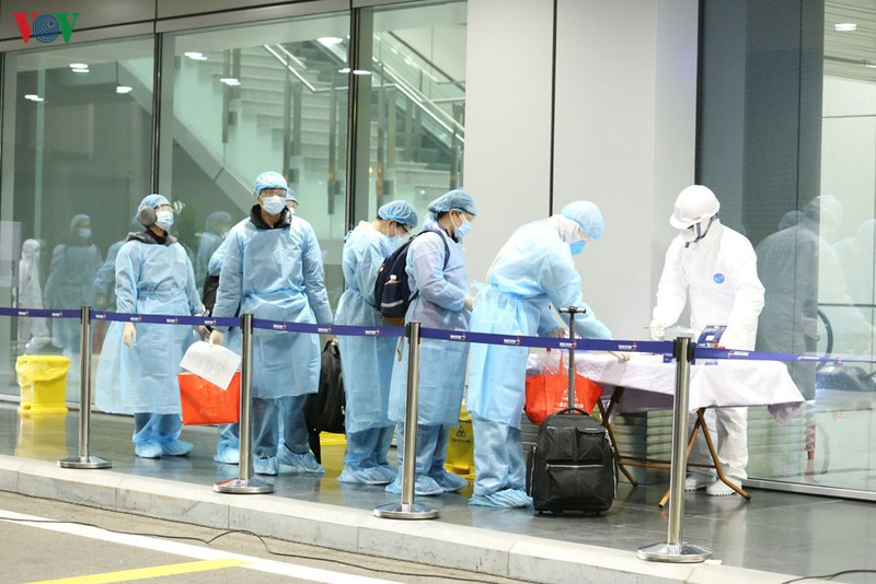 Những hành khách đầu tiên trên chuyến bay số hiệu HVN68 đưa công dân Việt Nam ở Vũ Hán về tới Cảng Hàng không Quốc tế Vân Đồn làm thủ tục nhập cảnh sáng 10/2.