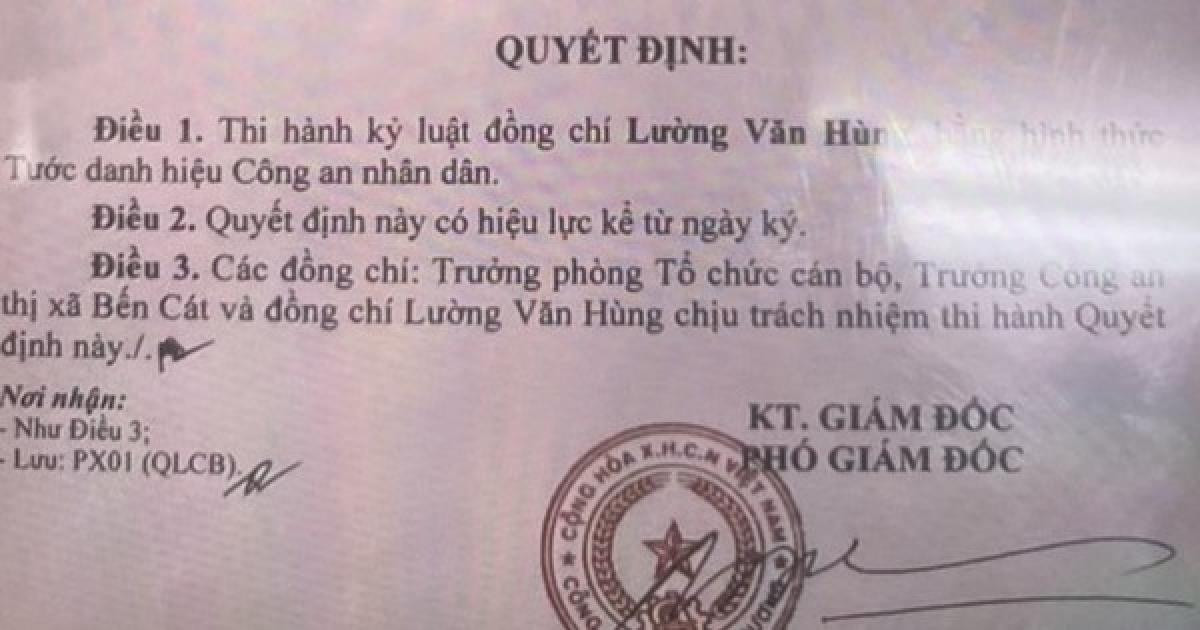 Quyết định thi hành kỷ luật của Công an tỉnh Bình Dương với Đại úy Lường Văn Hùng, Phó Trưởng Công an phường Tân Định, thị xã Bến Cát.