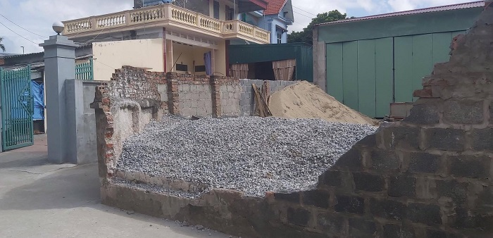 Đoạn tường bao nhà ông Tỵ cao khoảng 1,5 m, nửa dưới xây bằng gạch ba banh, nửa trên xây bằng gạch đỏ.