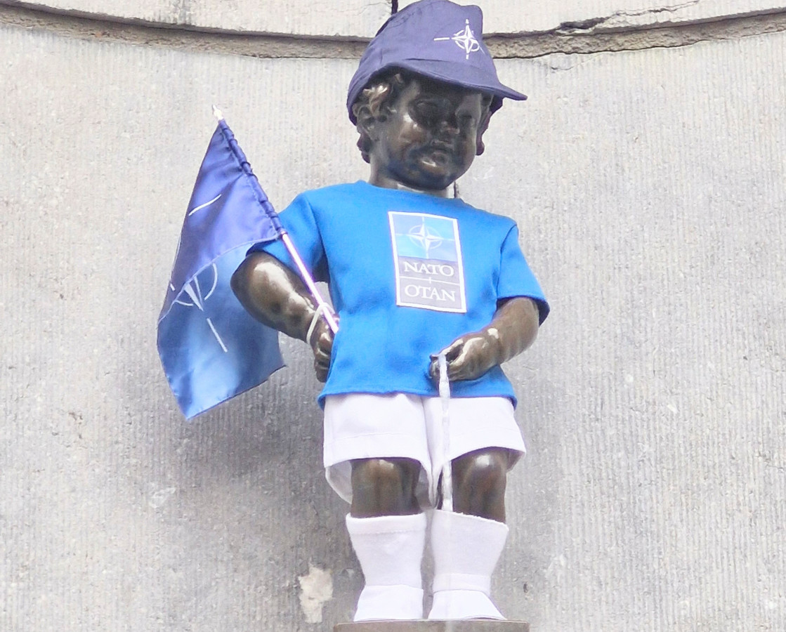 Hôm 4/4, thay vì hình ảnh trần truồng như thường ngày, bức tượng chú bé đứng tè Manneken Pis nổi tiếng, biểu tượng của thành phố Brussels (Bỉ), được khoác lên mình chiếc áo hình cờ và logo của tổ chức Hiệp ước Bắc Đại Tây Dương (NATO).