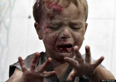 | Em bé Syria đau đớn và hoảng loạn nhìn những vết thương của mình sau một cuộc giao tranh mới đây |