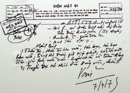 | Trong bức điện mật ngày 7/4/1975 gửi các đoàn quân đang tiến về Sài Gòn, Đại tướng viết: ..."Thần tốc, thần tốc hơn nữa. Táo bạo, táo bạo hơn nữa..." |