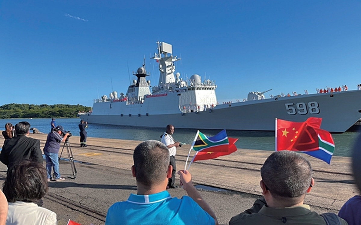 Tàu hộ vệ tên lửa 054A mang tên Nhật Chiếu của Trung Quốc cập cảng vịnh Richards của Nam Phi hôm 19/2. (Ảnh: Thời báo Hoàn cầu)