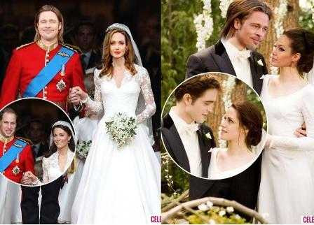 1. Brad Pitt và Angelina Jolie được ghép vào ảnh cưới của cặp đôi hoàng gia Anh ‘hot’ nhất năm 2011: Công nương Kate Middleton và hoàng tử. Chiếc váy tuyệt đẹp mà công nương xinh đẹp đang mặc do Sarah Burton của hãng Alexander McQueen thiết kế. |