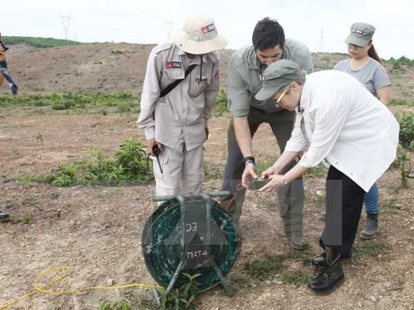 | Bà Rose Gottemoeller Thứ trưởng Ngoại giao Hoa Kỳ thăm hiện trường Dự án rà phá bom mìn của tổ chức MAG và NPA tại thôn Tràng Soi, xã Triệu Ái, huyện Triệu Phong, tỉnh Quảng Trị (Ảnh: Hồ Cầu/TTXVN) |