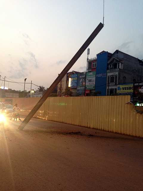 | Sau khi sự cố xảy ra, thanh sắt tiếp tục được cẩu lên để đưa vào phía bên trong công trường (Ảnh: otofun.net) |