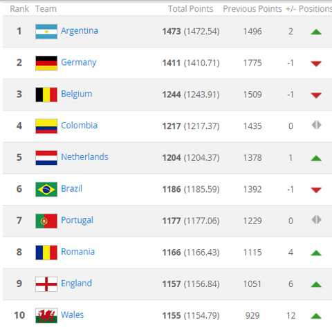 FIFA vừa công bố bảng xếp hạng tháng 7/2015, theo đó Argentina với gianh hiếu Á quân Copa America 2015 đã tăng 2 bậc để soán ngôi đầu thế giới của Đức. Trong khi đó, đối thủ vừa đánh bại Messi và các đồng đội ở Copa America 2015 là Chile nhảy 8 bậc để vươn lên vị trí thứ 11.