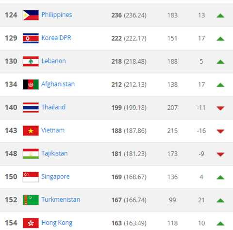 Việt Nam tụt 16 bậc và để Philippines, Thái Lan vượt mặt ở khu vực Đông Nam Á. Cụ thể trong tháng vừa qua, khi không thi đấu trận nào tại vòng loại World Cup 2018, Việt Nam đã rơi từ vị trí 127 thế giới xuống vị trí 143 thế giới và xếp thứ 3 ở vùng trũng.