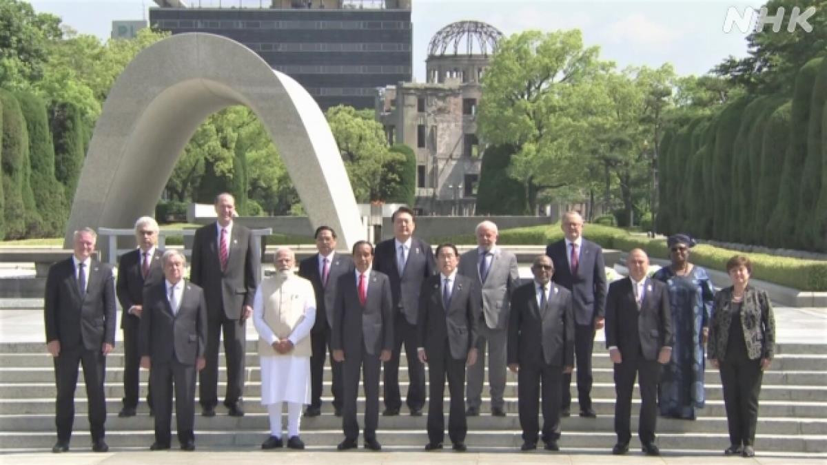 Các nhà lãnh đạo G7 cùng các nước là khách mời thăm công viên Hòa bình Hiroshima. (Ảnh: NHK)