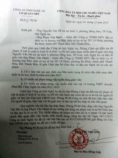 "Qua nghiên cứu tài liệu thu thập được, Phòng PC46 thấy rằng việc ông Nguyễn Văn Hà và ông Phạm Văn Mạnh tố cáo những nội dung sai phạm xảy ra tại Sở GD-ĐT là có cơ sở. Tuy nhiên những sai phạm nói trên chỉ là vi phạm về mặt hành chính liên quan đến việc tuyển sinh tuyển dụng, công tác cán bộ. Ngày 28/11/2013 Công an tỉnh Nghệ An đã có văn bản báo cáo số 831/CANA(PC46) gửi đồng chí Chủ tịch UBND tỉnh Nghệ An để xin ý kiến chỉ đạo", nội dung hồi âm của Công an tỉnh Nghệ An trả lời công dân ở văn bản số 847/PC46 ghi rõ.