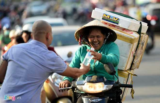 Những thùng nước suối miễn phí xuất hiện dọc tuyến đường. Các thành viên nhóm từ thiện Gia đình 7 màu cho biết trong những ngày cao điểm lễ hội trung bình phát gần chục nghìn chai.