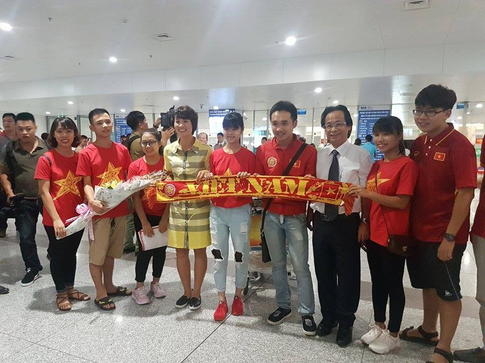 Dù trở về lúc gần nửa đêm nhưng thầy trò HLV Mai Đức Chung vẫn được đón tiếp nồng nhiệt bởi các lãnh đạo LĐBĐ Việt Nam cũng như đông đảo người hâm mộ. Một số cựu tuyển thủ như Kim Chi, Ngọc Mai hay Minh Nguyệt cũng ra sân bay đón các đàn em mang HCV về nước.