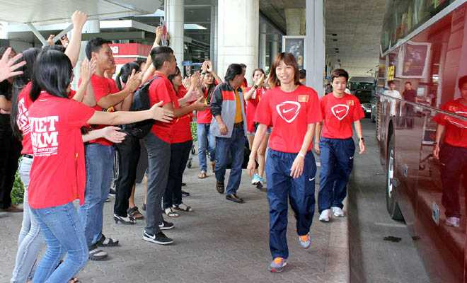 Đã có khoảng hơn chục CĐV mặc áo đỏ để đón các cô gái ĐT nữ Việt Nam. Khoảng 14h, sau khi hoàn tất thủ tục ở sân bay Tân Sơn Nhất, toàn đội bước ra và không ít người bất ngờ trước sự đón chào của CĐV.