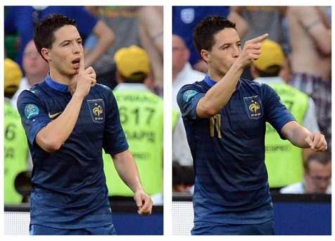 | Màn ăn mừng khiêu khích của Nasri sau bàn thắng vào lưới ĐT Anh. |